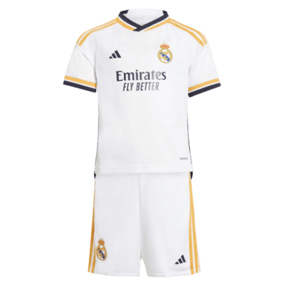 For most football teams, winning is everything. For this one, it’s part of a grander design. Like the club it represents, this kids’ adidas Real Madrid kit stands for elegance and style. It includes supporter versions of the timeless jersey and shorts the players wear, as well as a pair of crew-length socks. AEROREADY ensures young fans always feel comfortable in those famous white colours. Made with a series of recycled materials, and at least 70% recycled content.