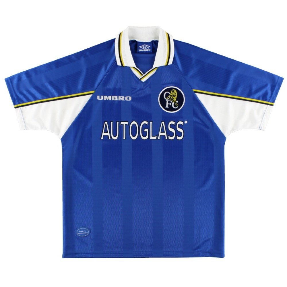 The Chelsea 1997-99 Home Shirt as worn by players such as Gullit, Poyet, Hughes and Zola as the team finished 4th in the Premiership and won both the League Cup and the UEFA Cup Winners’ Cup.